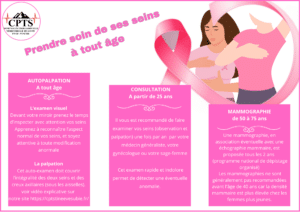 A l’occasion d’Octobre Rose, mois de sensibilisation au dĂ©pistage organisĂ© du cancer du sein, la CPTS TinĂ©e VĂ©subie  a rĂ©alisĂ© un petit mĂ©mo  » comment prendre soin de ses seins Ă  tout Ăąge » et un tuto santĂ©  » comment faire l’autopalpation des seins « .