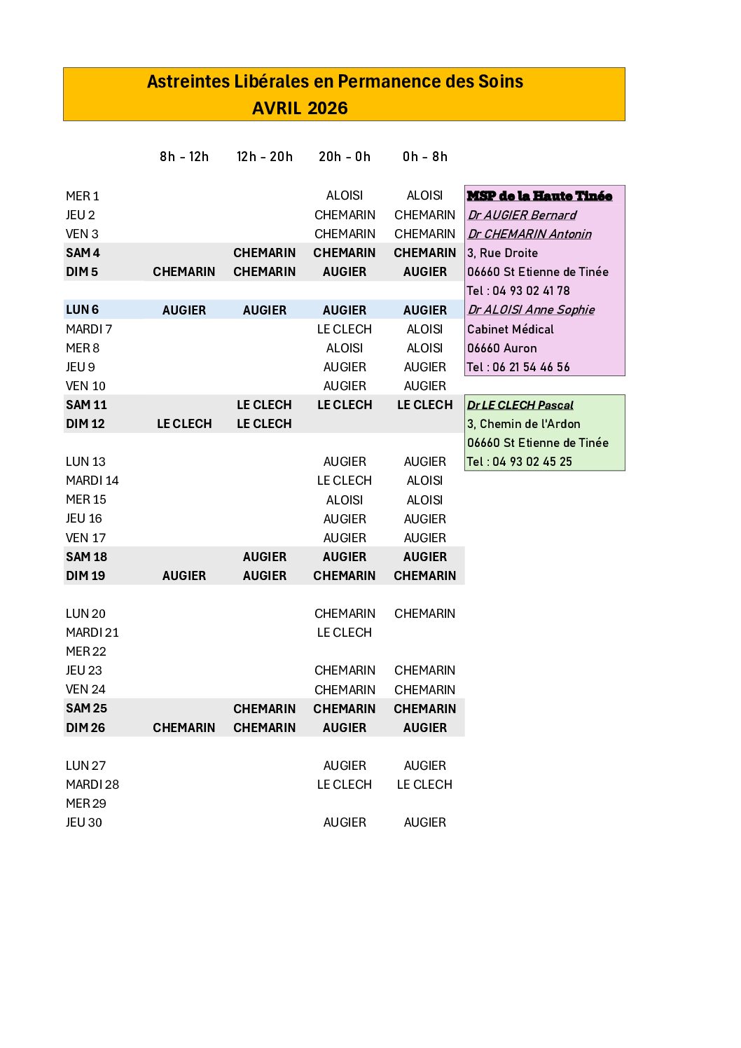 Petite modification du tableau d'astreintes médecins de la Haute Tinée Le Dr AUGIER assurera la nuit du vendredi 10.04.2026, de 20h à 8h samedi matin.